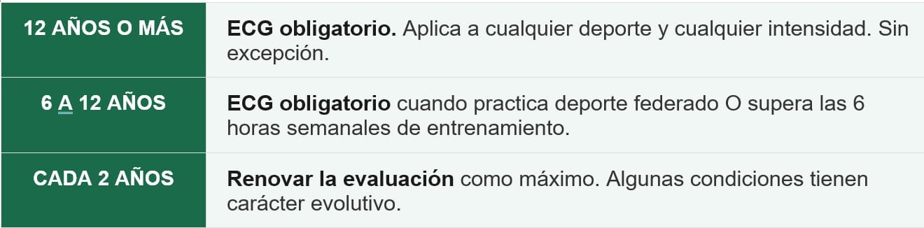 Interrogatorio con antecedentes personales y familiares: muerte súbita en familia, síncopes, palpitaciones, dolor de pecho con el esfuerzo. Examen físico cardiovascular orientado. ECG de 12 derivaciones interpretado con los criterios de Seattle refinados — los criterios internacionales vigentes para deportistas.